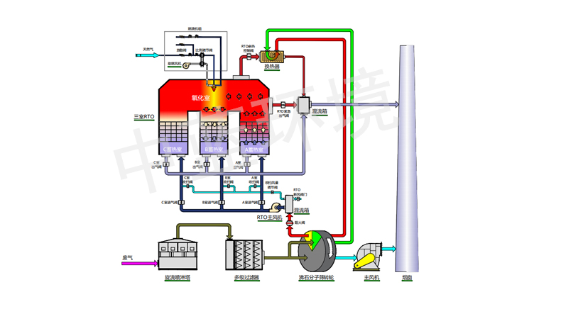 3. RTO氧化階段:沸石轉輪實際上是個濃縮裝置,把低濃度大風量有機黄瓜视频免费观看裏的分子捕捉、富集到沸石分子篩上麵。當脫附時就能用很小的