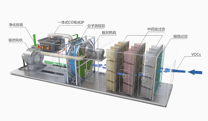 1) 有機黄瓜视频免费观看先經過幹式過濾預處理箱體去除黄瓜视频免费观看中的粉塵等顆粒物,防止該類物質進入到沸石轉輪中引起轉輪效率下降;